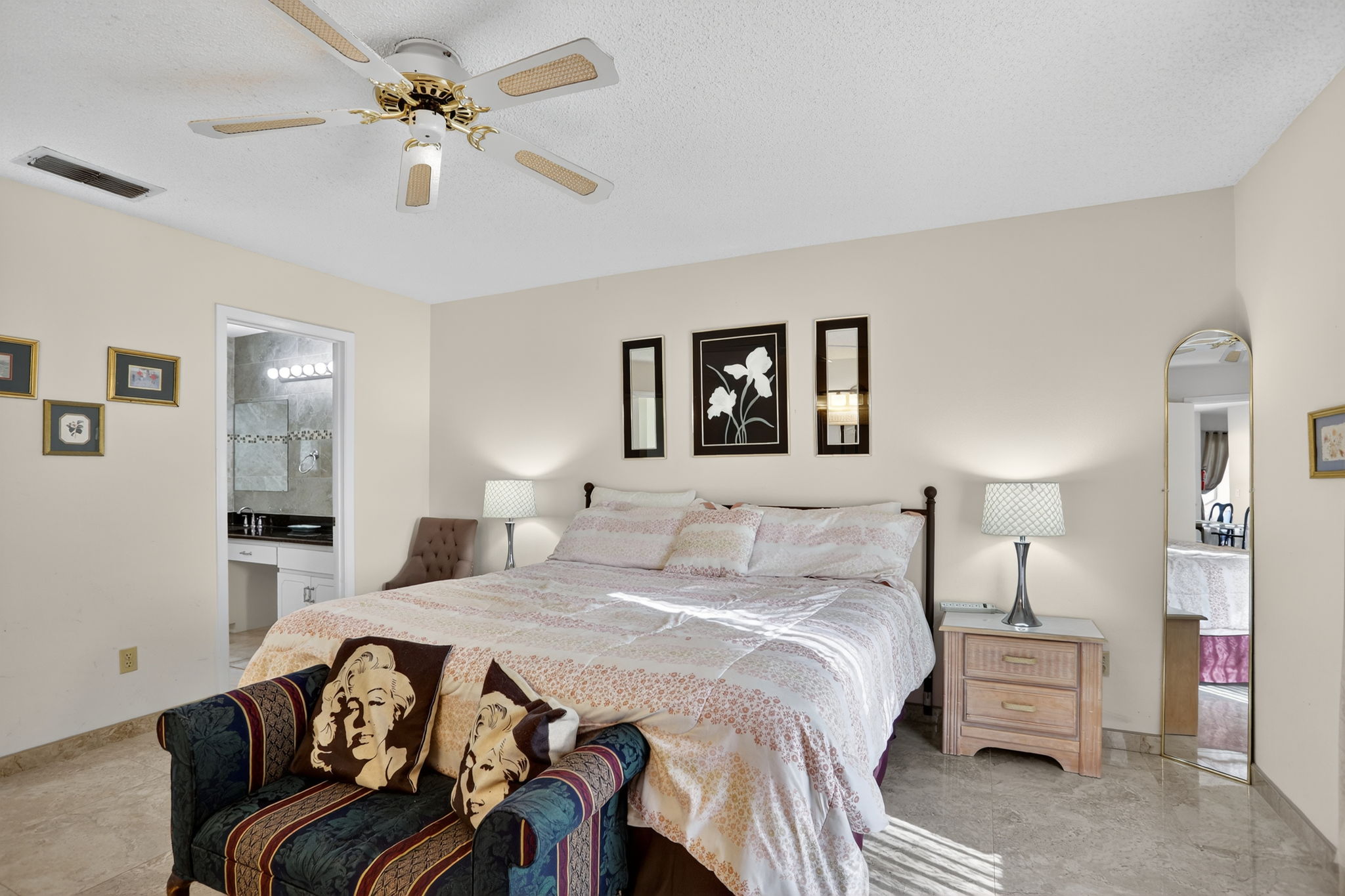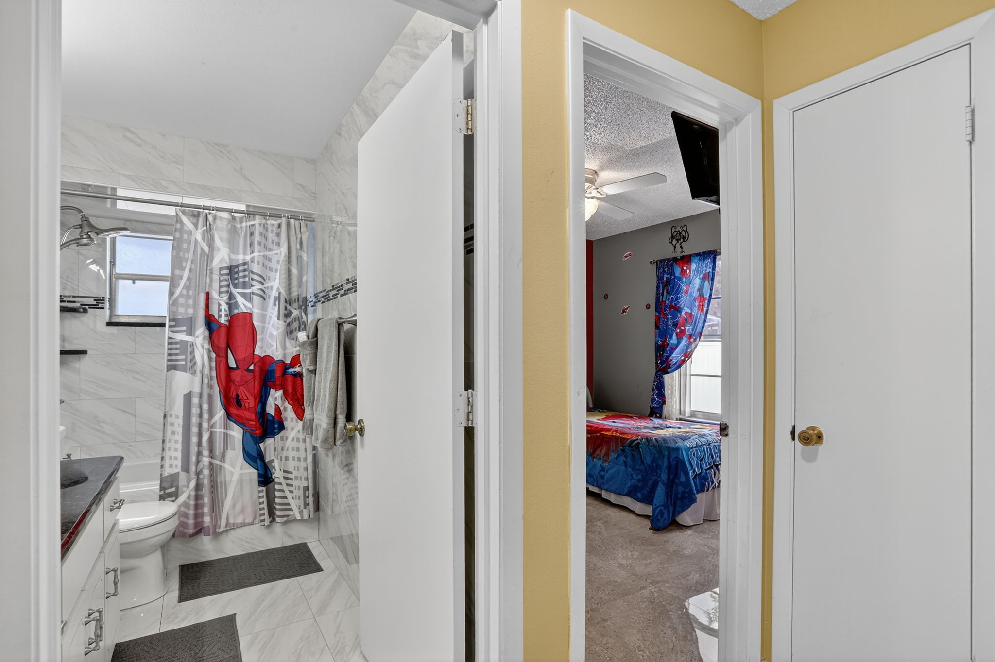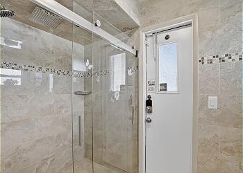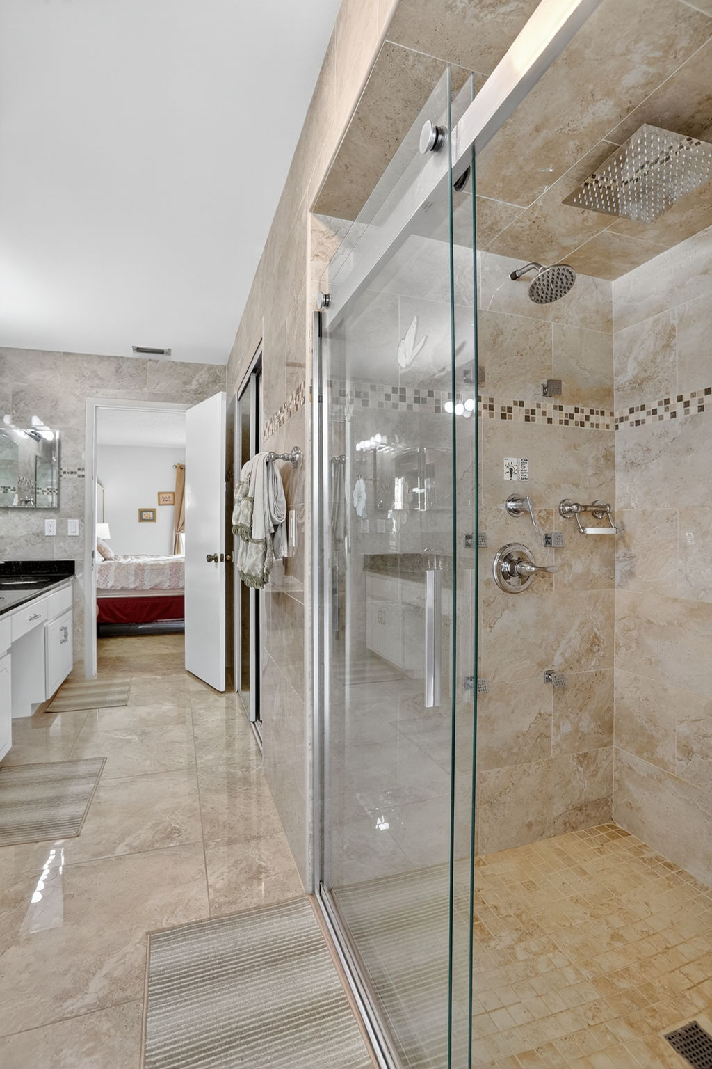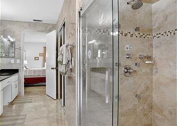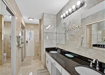 Primary bathroom, w/ walk-in shower, dual sinks, pool access [23]