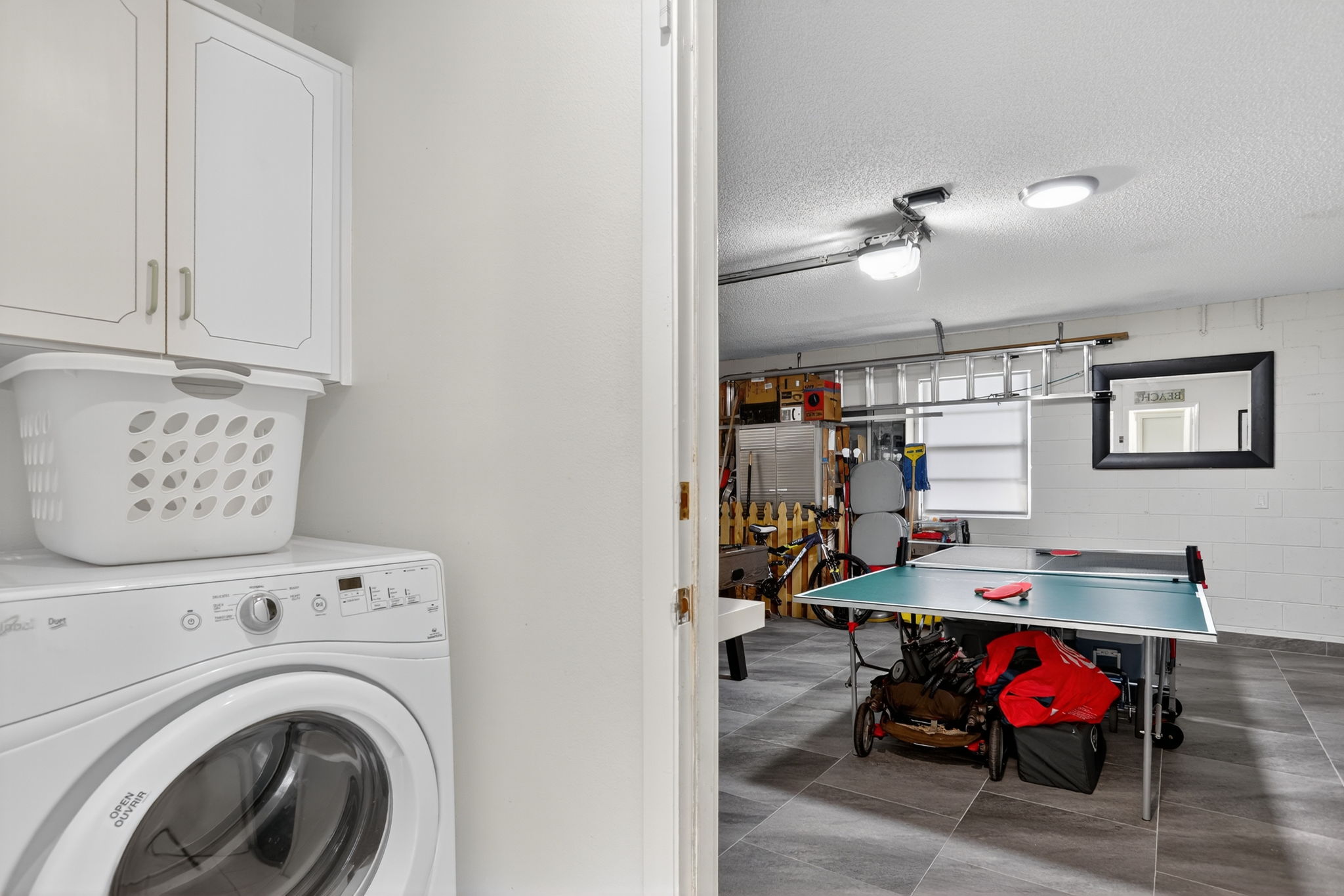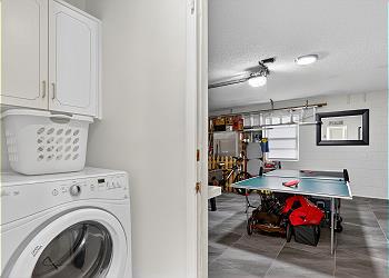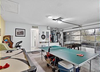 Near the hallway is the door to the laundry room, where the full-size washing machine and dryer are located. Iron and ironing board are present too. In the garage itself, you will find an air-hockey table, table tennis table (ping-pong), Foosball table, and an arcade style Pac-Man video game console.