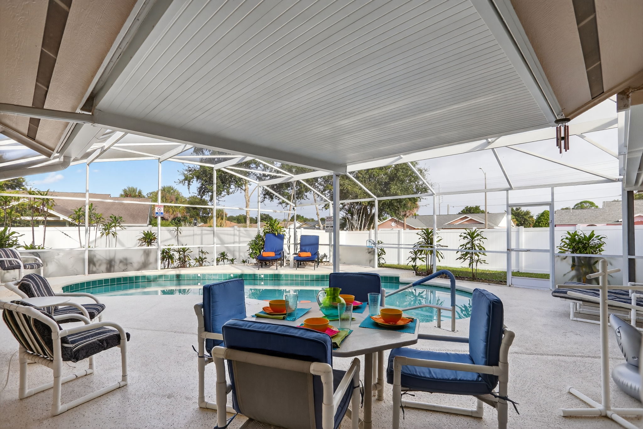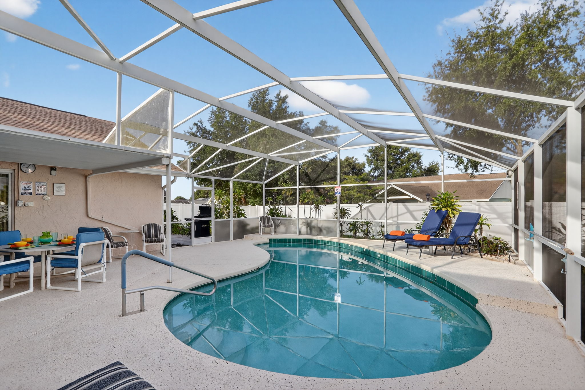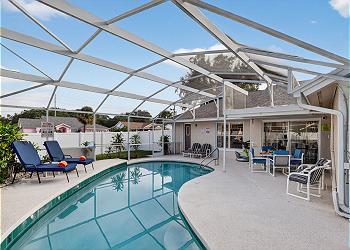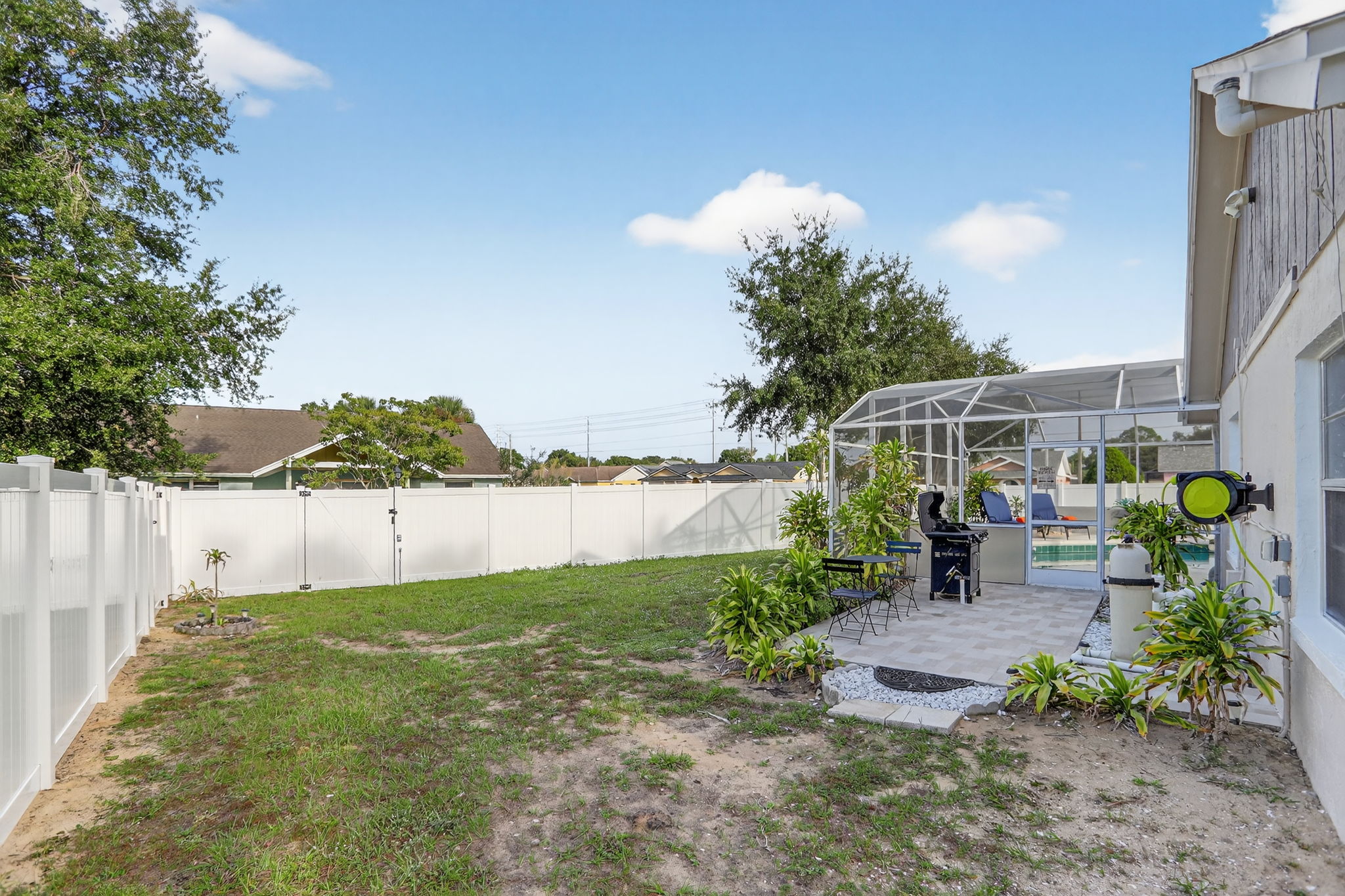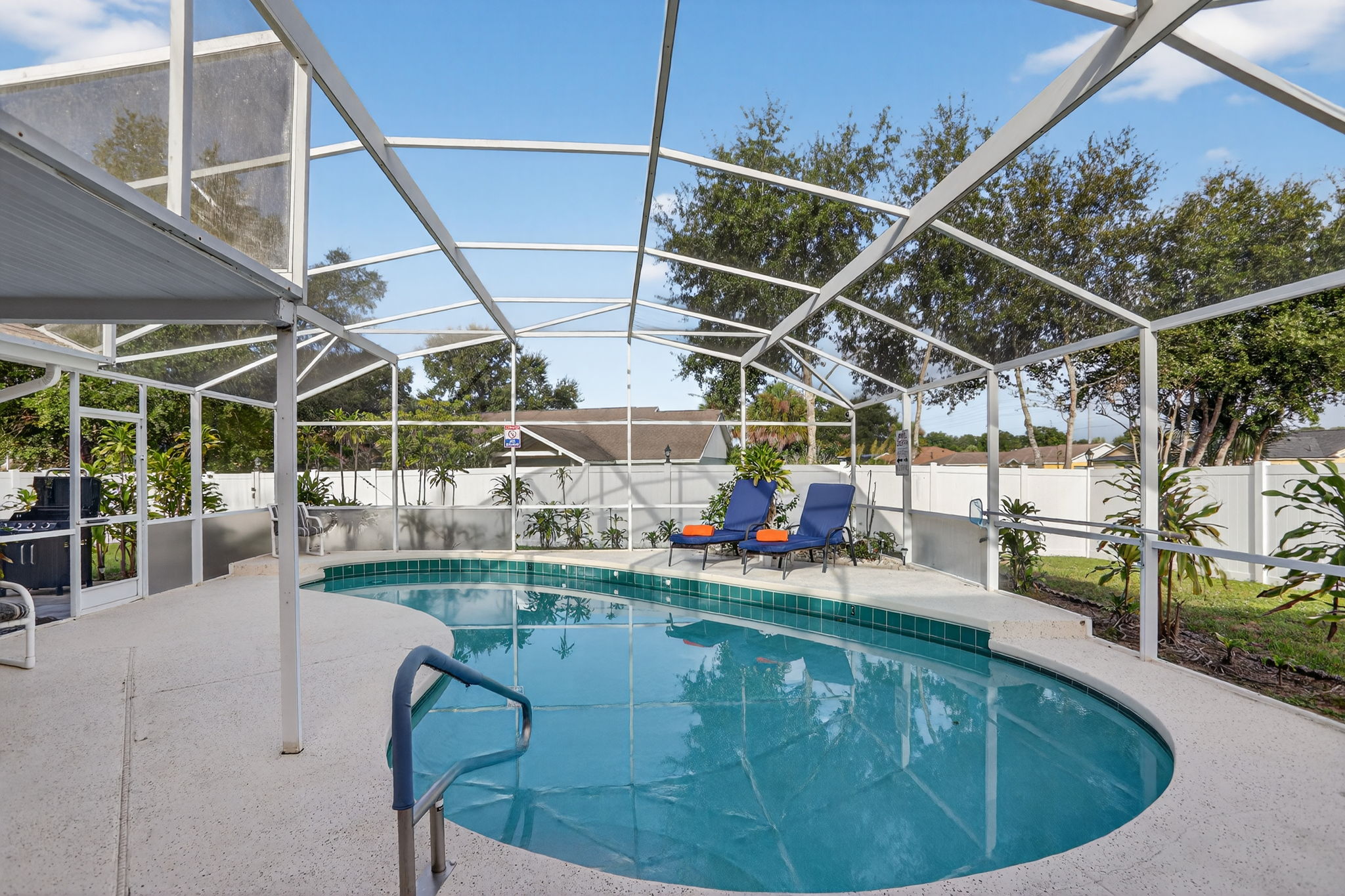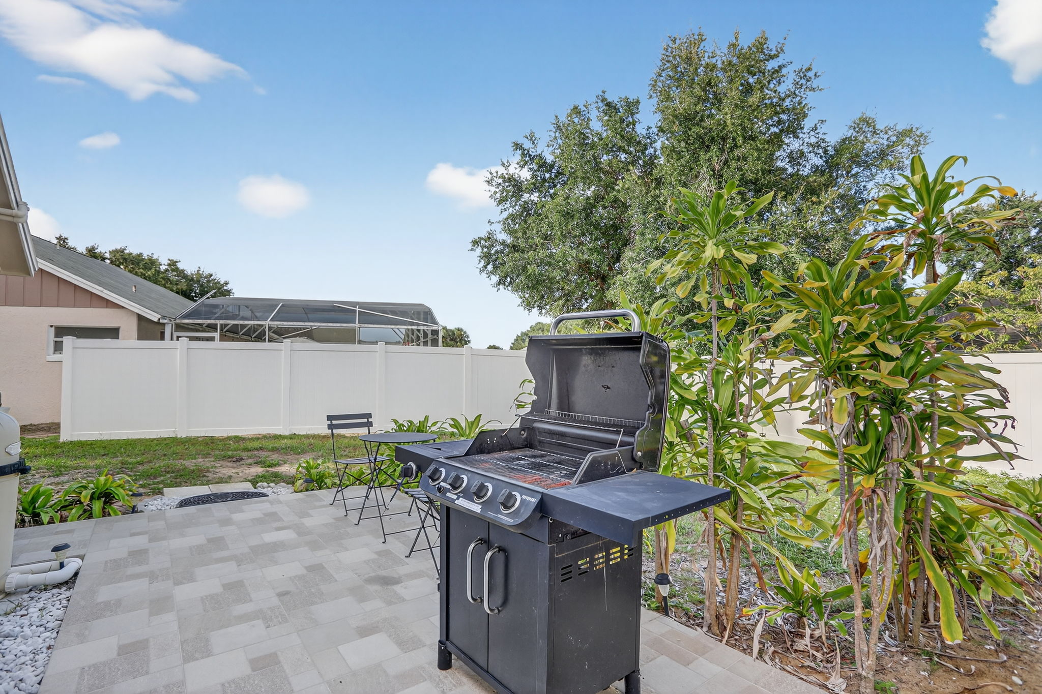 From the family room, kitchen and dining area you look onto the pool area. Through sliding doors you have access to the large pool deck (screened in) with the inviting, private pool. The pool area and back yard are fully fenced in, for added privacy. Pool deck chairs allow for that tasty breakfast ‘al fresco’ and sun loungers allow for great late night, pool side relaxing. Enjoy a cookout with the complimentary gas grill, located on the paved patio right outside the pool enclosure.
