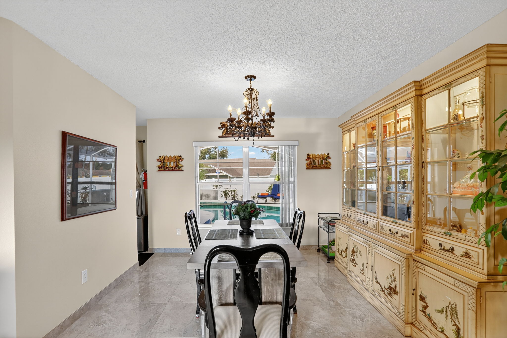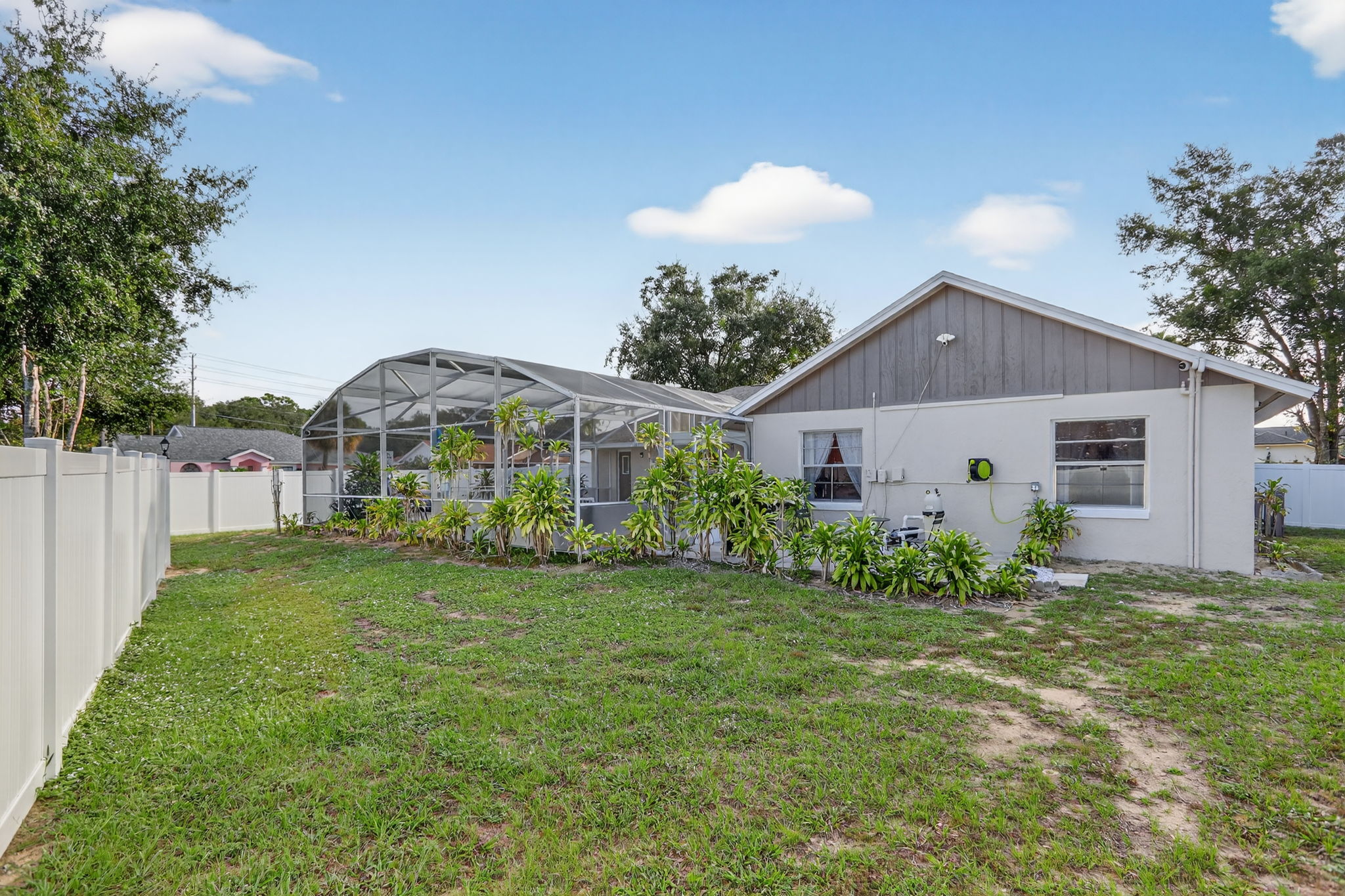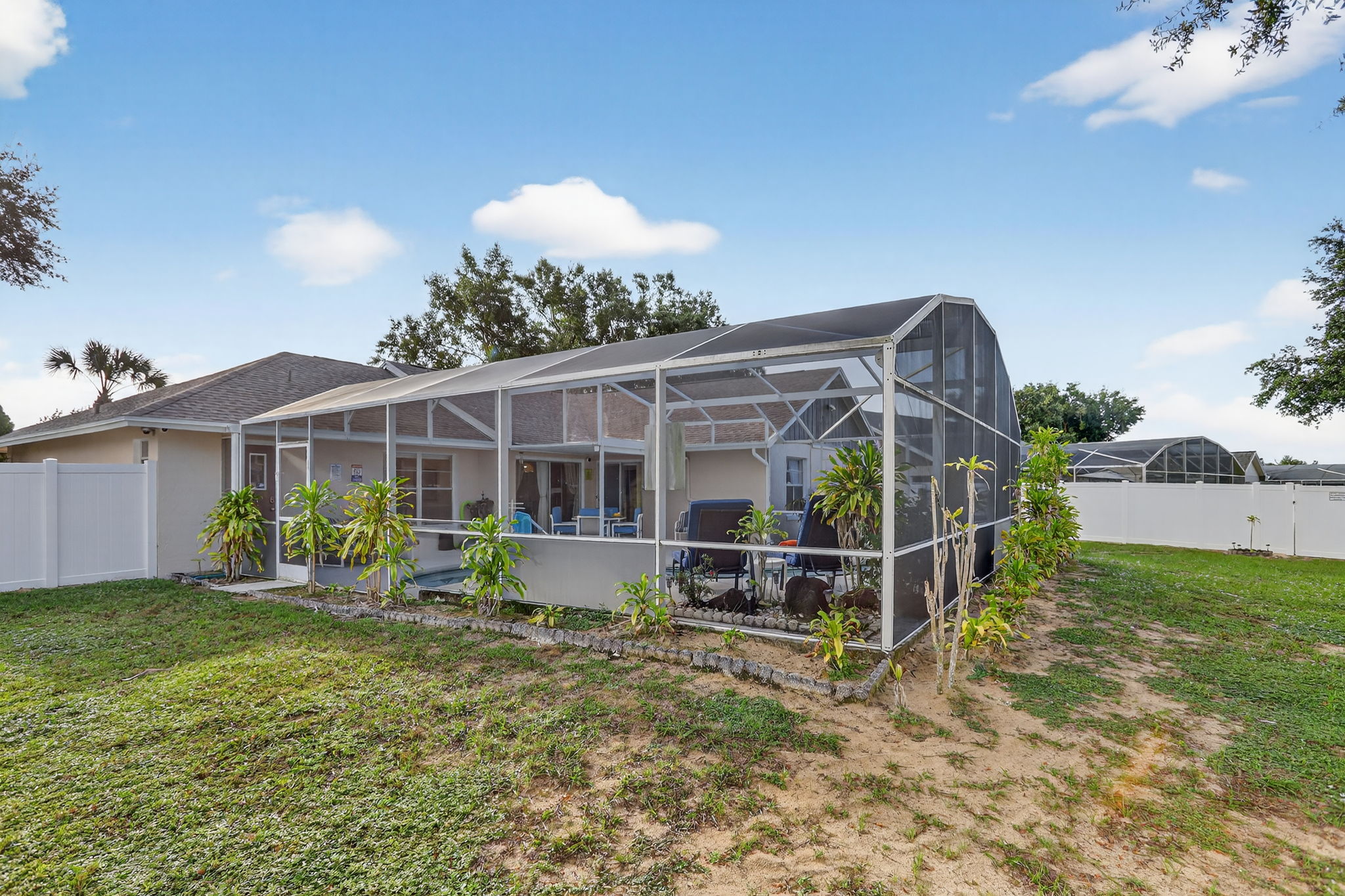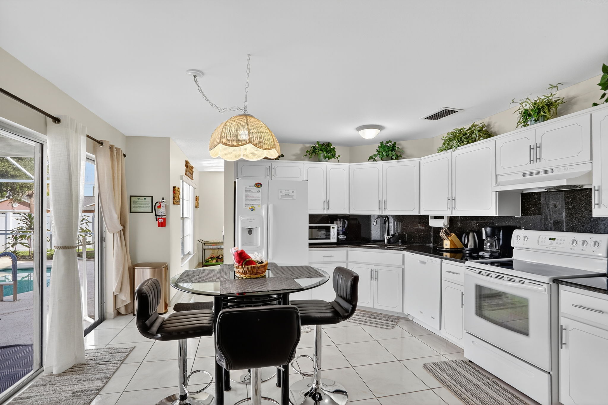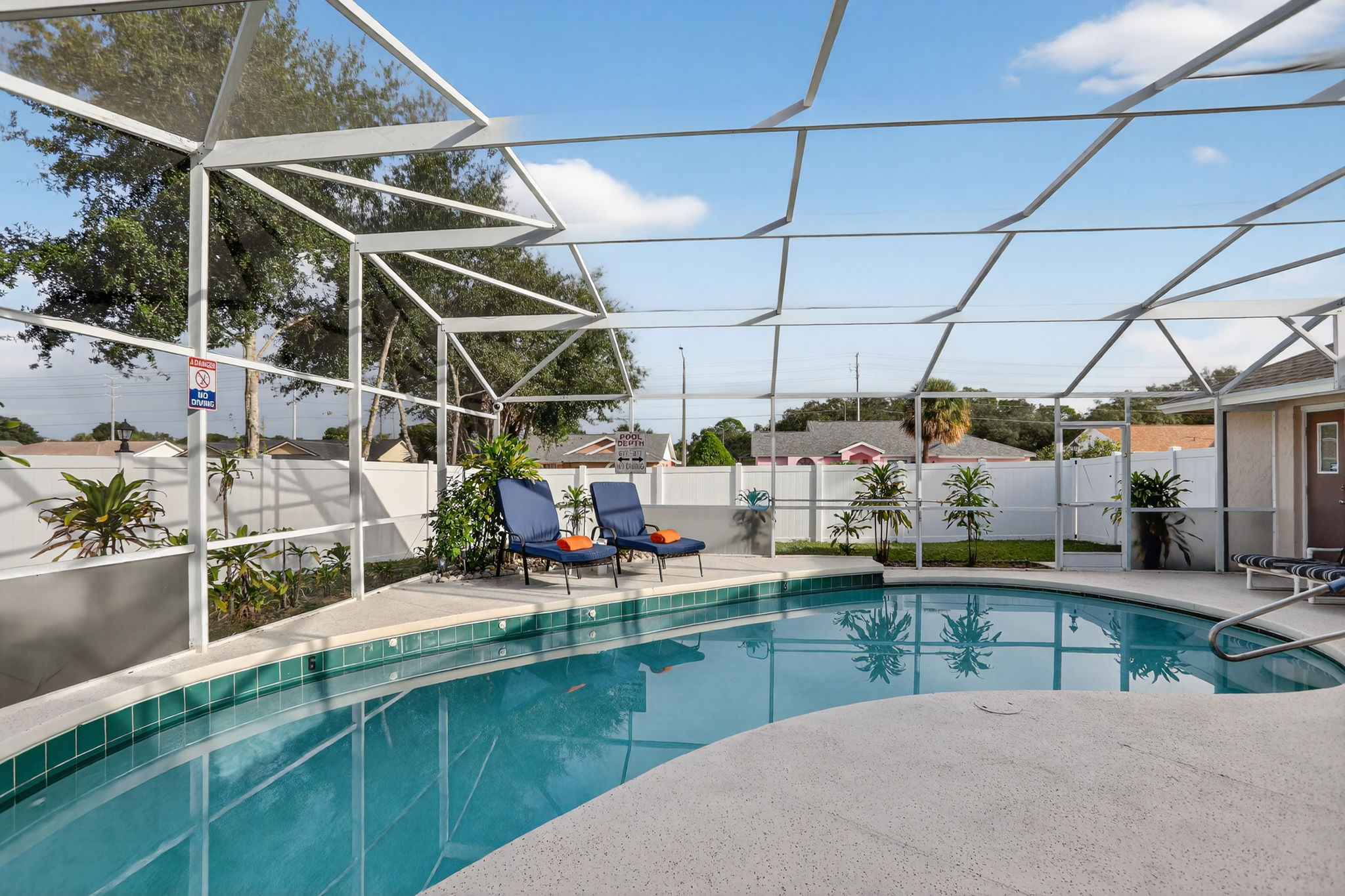 From the family room, kitchen and dining area you look onto the pool area. Through sliding doors you have access to the large pool deck (screened in) with the inviting, private pool. The pool area and back yard are fully fenced in, for added privacy. Pool deck chairs allow for that tasty breakfast ‘al fresco’ and sun loungers allow for great late night, pool side relaxing. Enjoy a cookout with the complimentary gas grill, located on the paved patio right outside the pool enclosure.