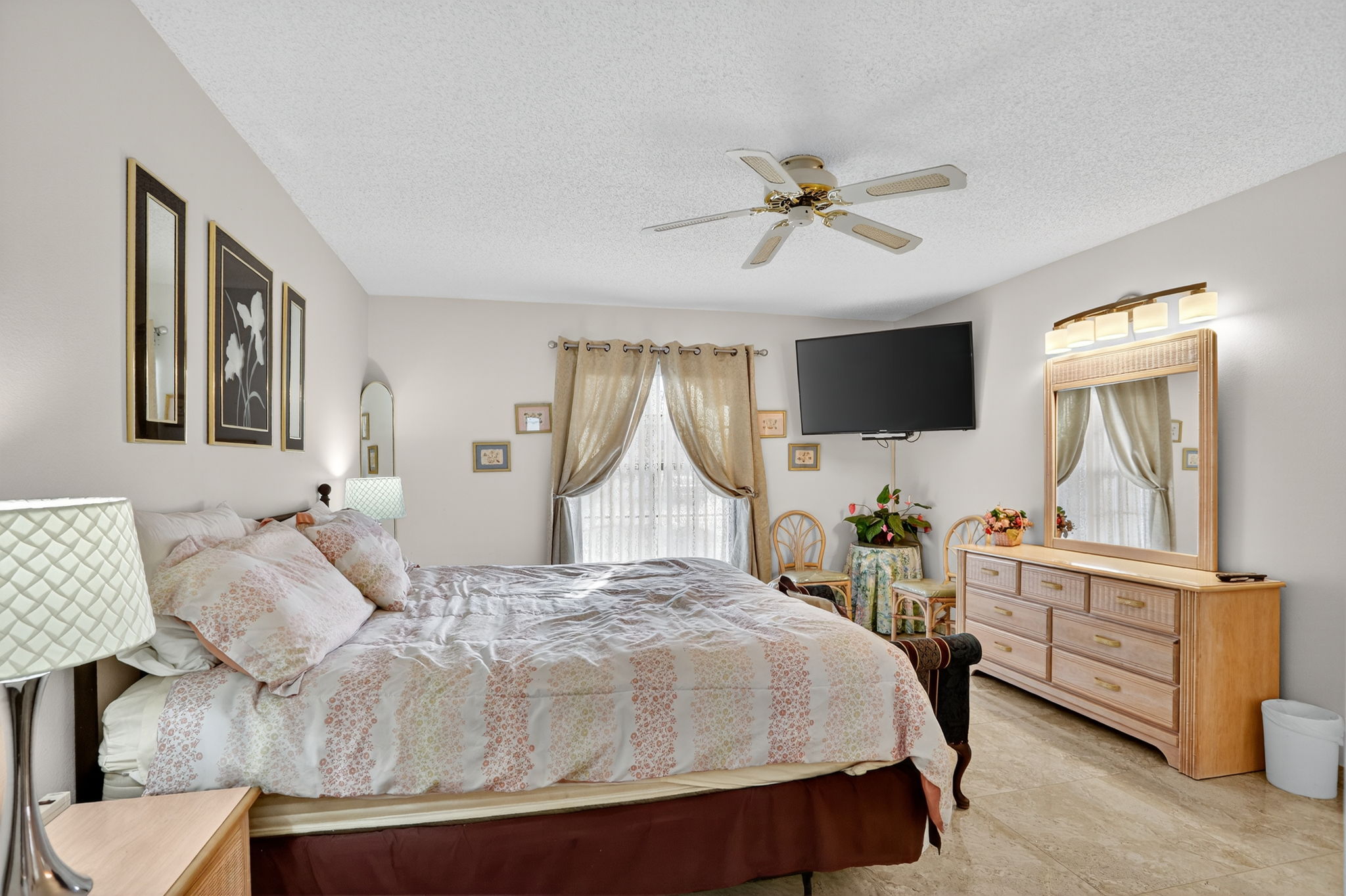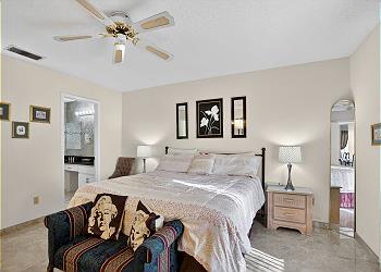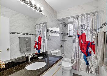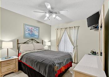 The Master bedroom has a King size bed and a 55" smart TV, with en suite bathroom offering dual sinks, walk-in shower, toilet and direct pool access (very convenient for that quick shower before or after a refreshing swim); the second bedroom also offers a Queen size bed and 32" flat screen TV. The other two bedrooms feature 2 Single beds each, one of them also with a 32" flat screen TV. These bedrooms share the second bathroom, with shower tub, vanity and toilet. All four bedrooms have plenty of closet space and a ceiling fan (in addition to the central air conditioning).